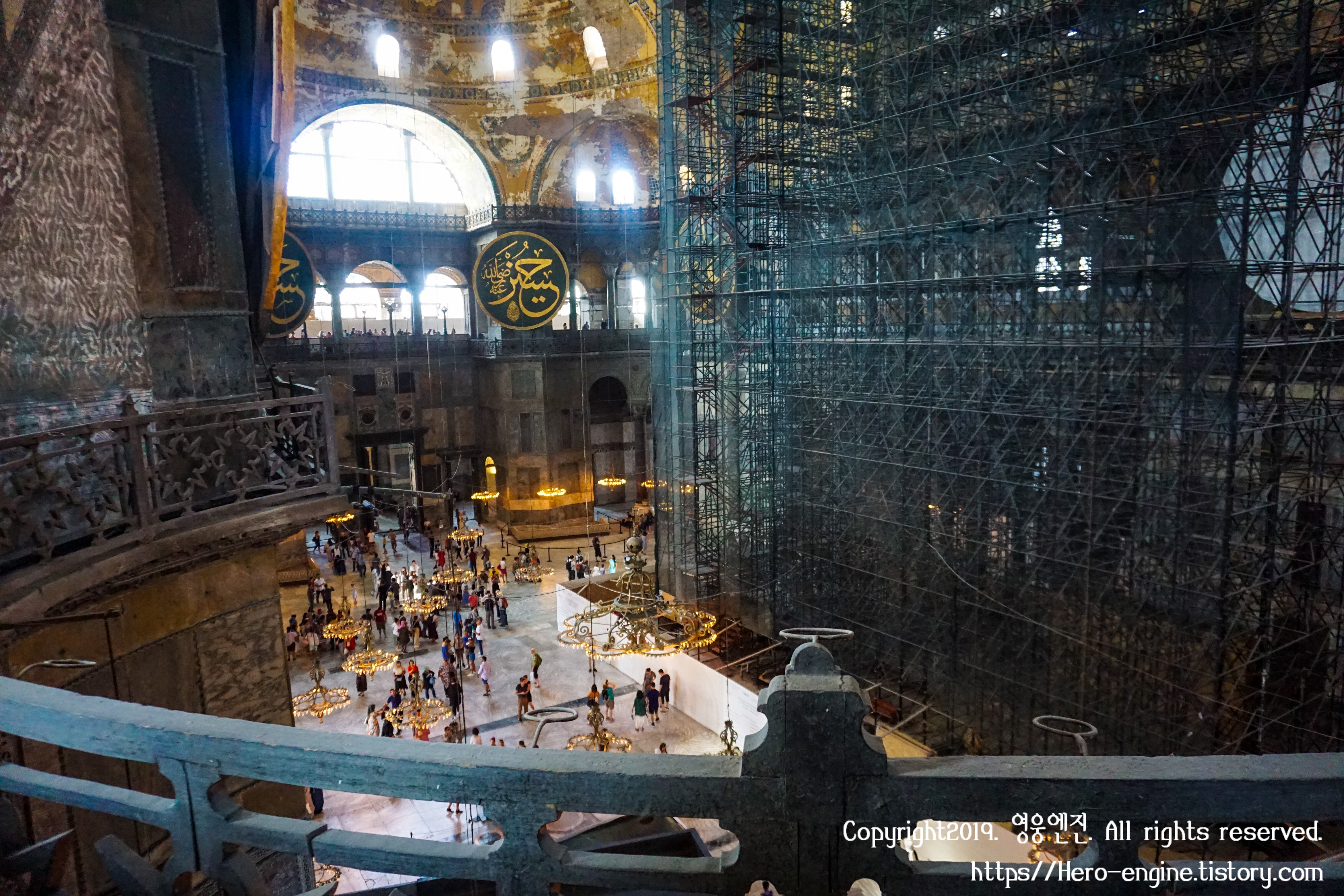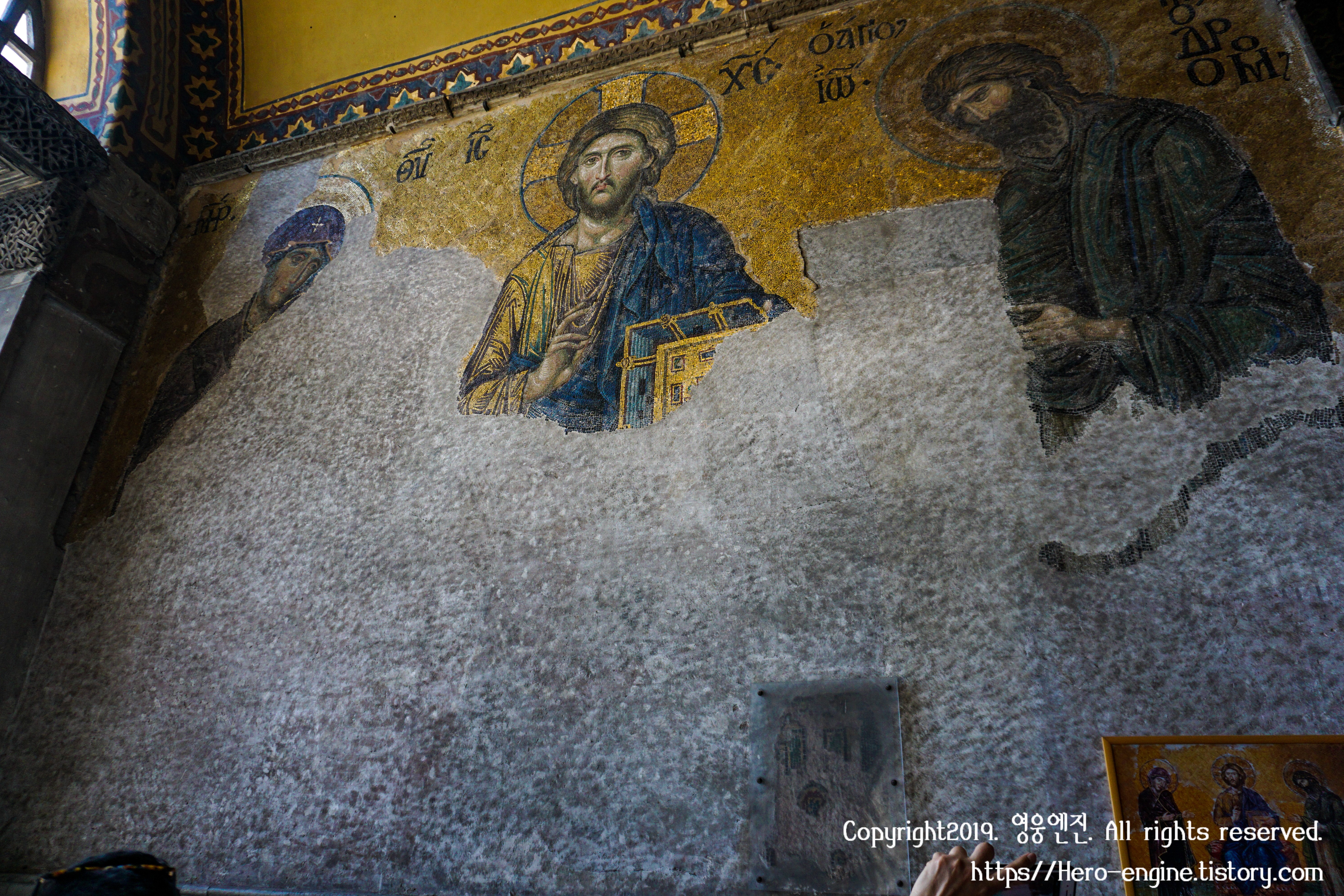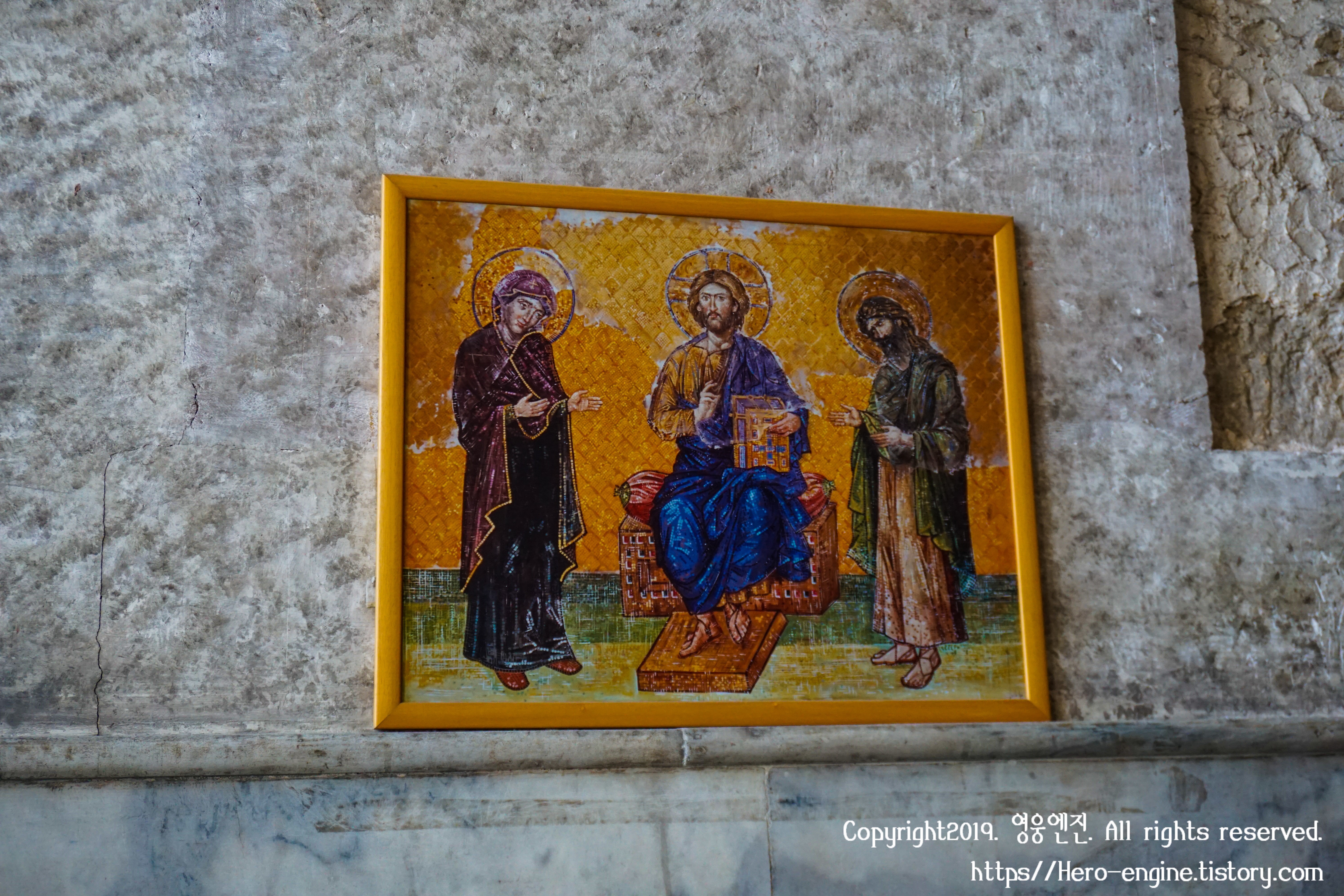 더 정확한 역사적 사실은 1453년 콘스탄티노플이 함락되고 술탄 메흐메트 2세 집권하게 되죠. 그때부터 모스크로 사용되었는데 1700년대 이후에 벽화 즉, 모자이크를 칠보로 덧칠해버리는 바람에 그동안 숨겨져 있었어요.
