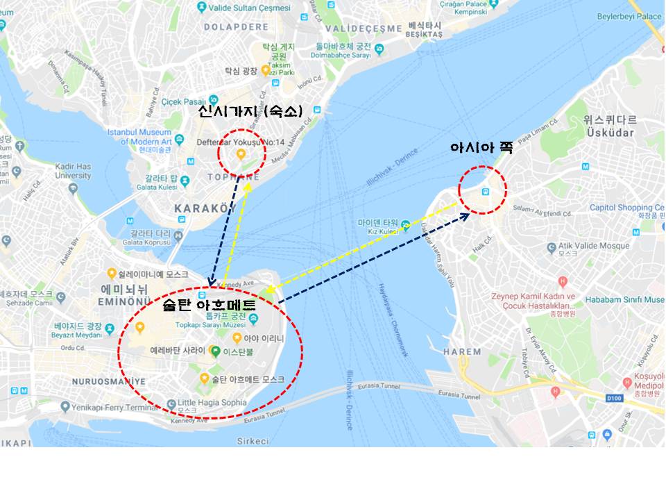 이스탄불 투어 경로 ( 숙소 -> 모스크 정복 -> 아시아 쪽 느낌 보기 )