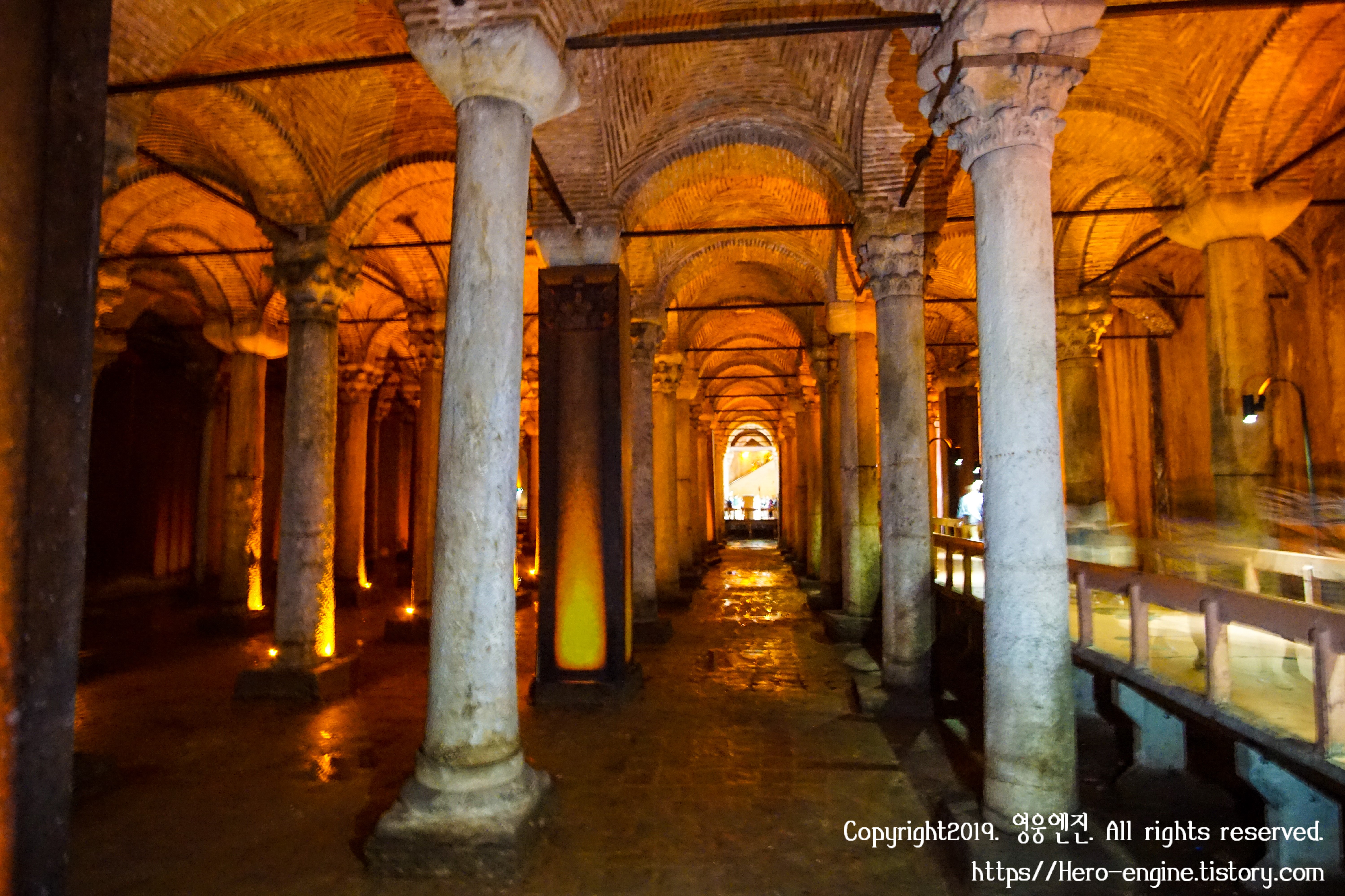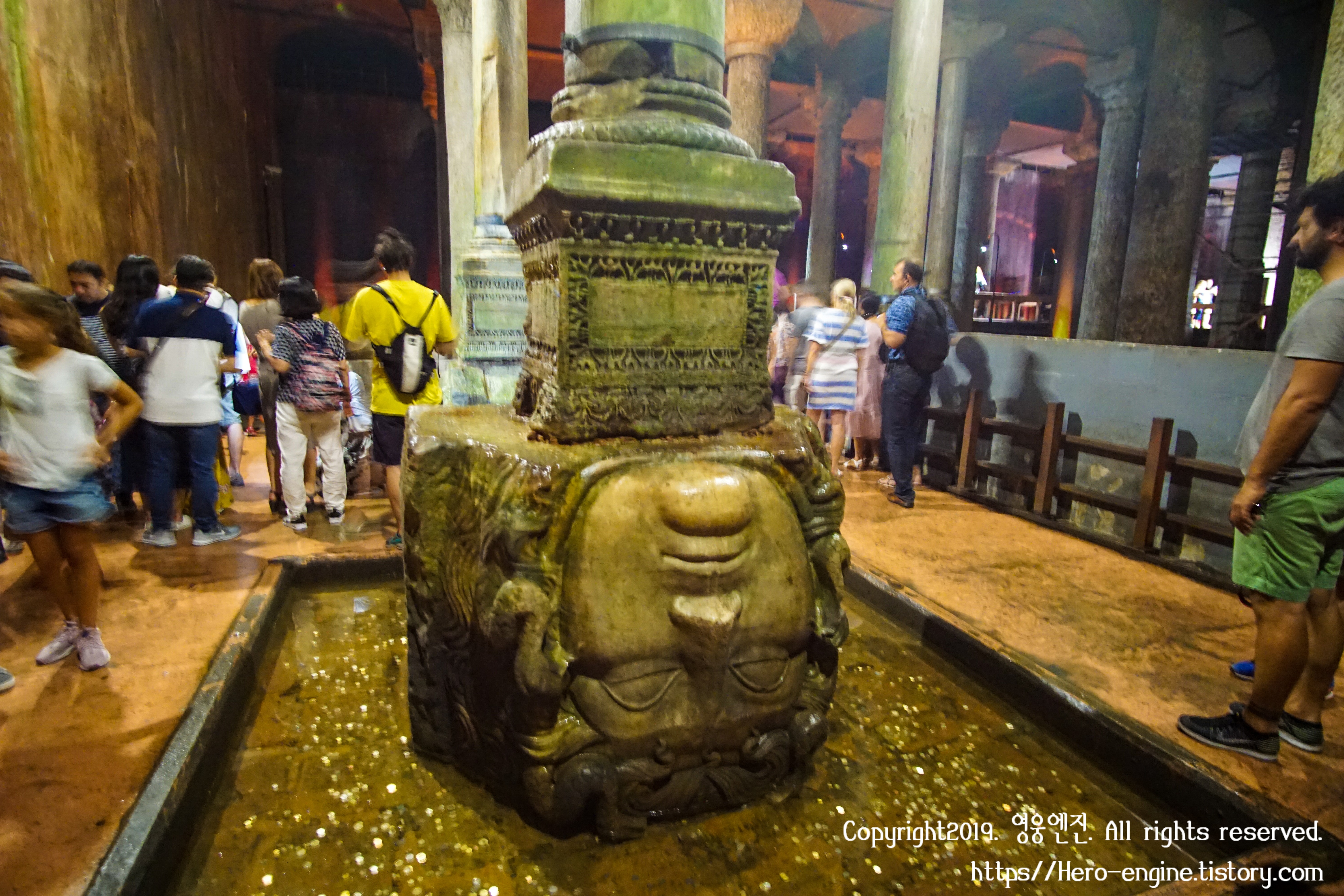 이곳은 지하궁전이라고 불리는데 4세기부터 6세기, 콘스탄티누스 황제부터 유스티니아누스 황제 시대에 걸쳐 만들어졌다고 하는 곳이에요. 물 창고로 사용된 곳이라고 합니다.