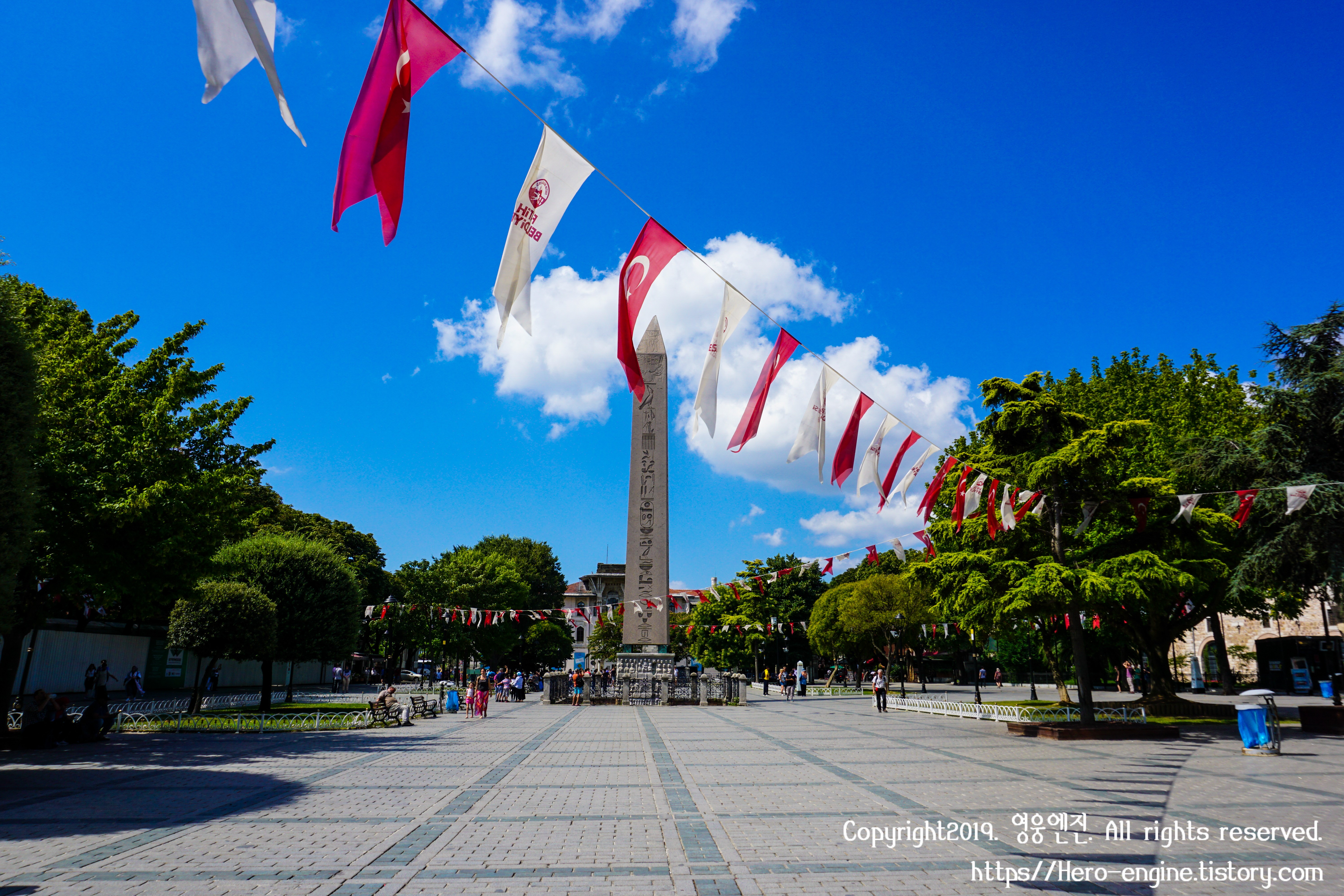지금 위치는 술탄아흐메트 광장입니다. 여기 광장은 길게 뻗어 있고 중간중간에 비석과 같은 조형물이 자리하고 있었습니다. 사실 저기 첨탑이 별로 관심 없었습니다만... 포스팅하면서 찾아보게 되었습니다.