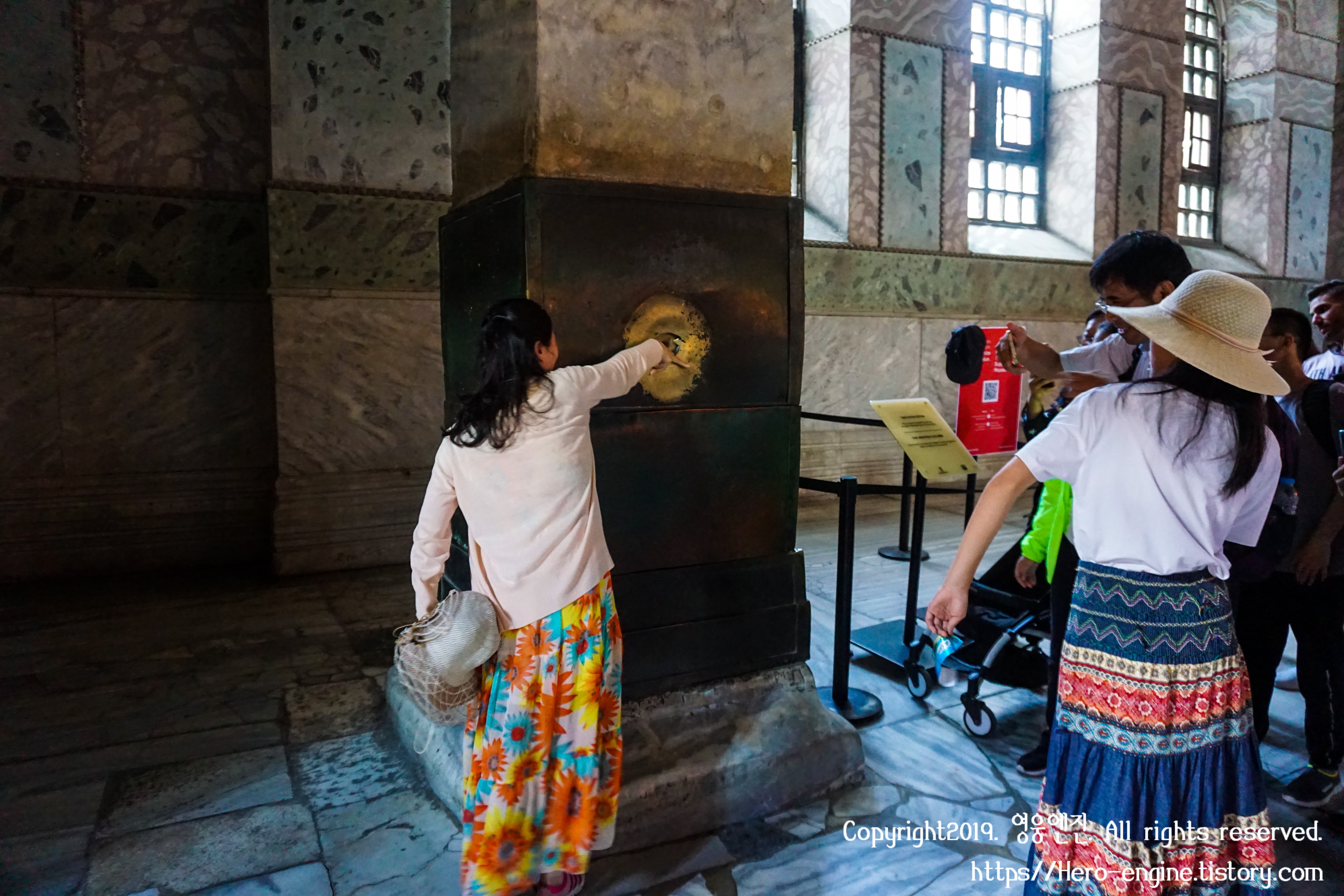 멀리서 열명 정도가 줄 서서 기다리는 곳을 발견합니다. 이곳은 성모 마리아의 손 모양으로 일컬어지는 기둥이에요. 움푹 파인 곳에 손가락을 넣어 물로 적셔지면 시력이 좋아진다고 하는데...? 자손이 복을 받는 다는데...? 등의 설이 있지만 엄지를 넣고 원을 끝까지 그리면 소원이 이뤄진다고 합니다. 유연하고 볼일이죠? ㅎㅎ